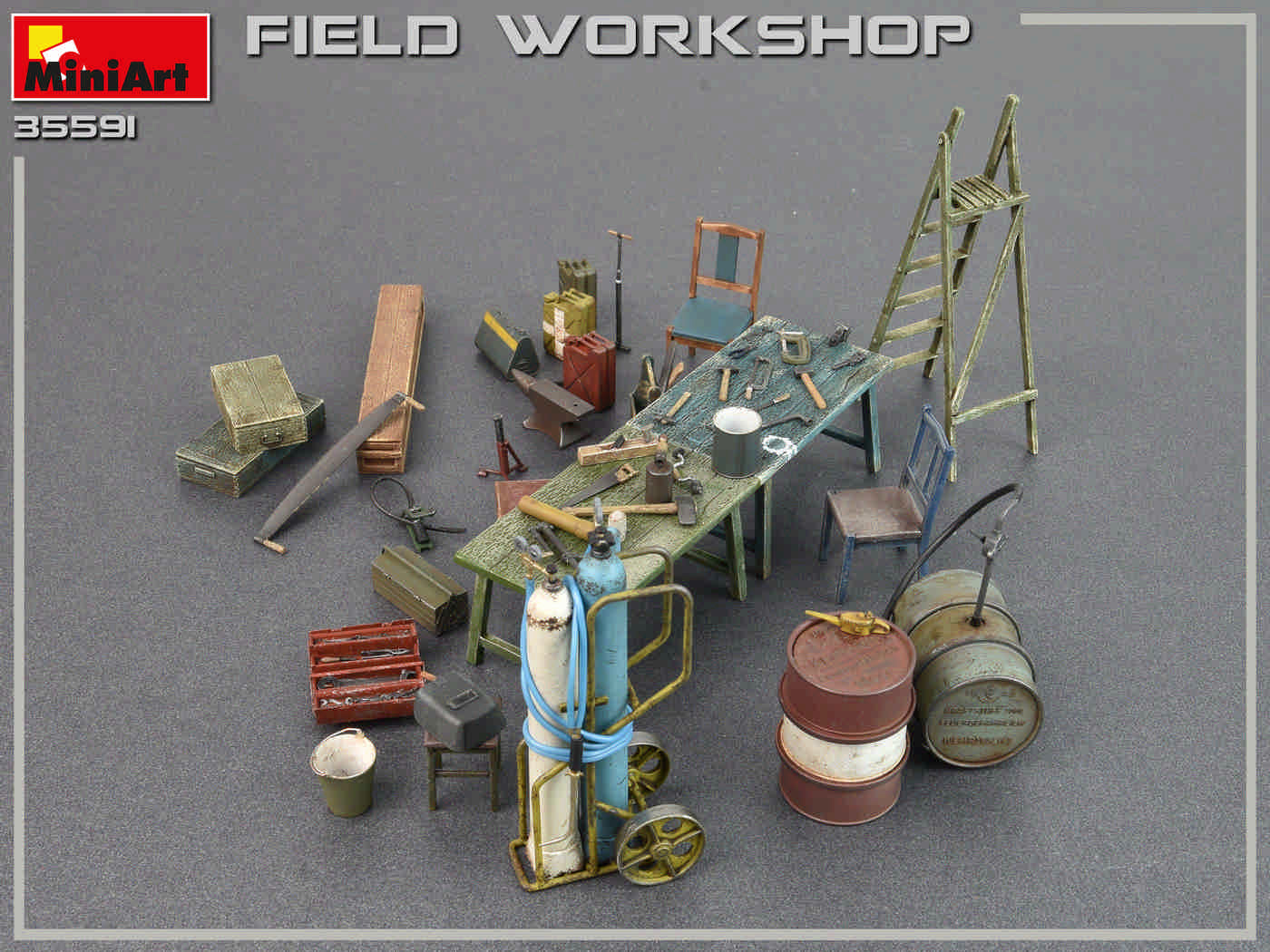 Kit contains models of: gas cylinders, ladders, table, buckets, cart, anvil, beams, jack stand and tools