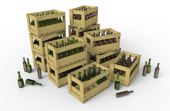 This set contains models of wine bottles and wooden crates
