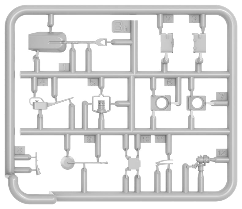 The kit includes models of tools in 1/35 scale: backsword, file, saws, hammers, axes, clamps, shovels, crowbars, oil cans, gas-burners, fire extinguisher, light fixture, wrenches, screwdrivers, tool boxes.